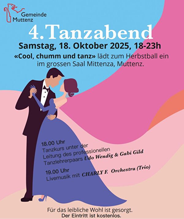 Die Kultur- und Sportkommission lädt zum 4. Tanzabend in den grossen Saal des Mittenza ein. Haben Sie Lust, Ihr Tanzbein zu schwingen, Ihre Tanzkenntnisse aufzufrischen oder Standardtänze wie Foxtrott, Cha-ChaCha, Walzer oder Rumba zu erlernen? Wir bieten Ihnen beste Gelegenheit, am 4. Tanzabend «Cool, chumm und tanz» teilzunehmen. Start ist um 18.00 Uhr mit einem Tanzkurs unter der Leitung des professionellen Tanzlehrerpaars Udo Wendig und Gabi Gild. Ab 19.00 Uhr LiveMusik mit dem «Charly F. Orchestra (Trio)». Für das leibliche Wohl ist gesorgt. Wir freuen uns auf einen gemütlichen Abend.
