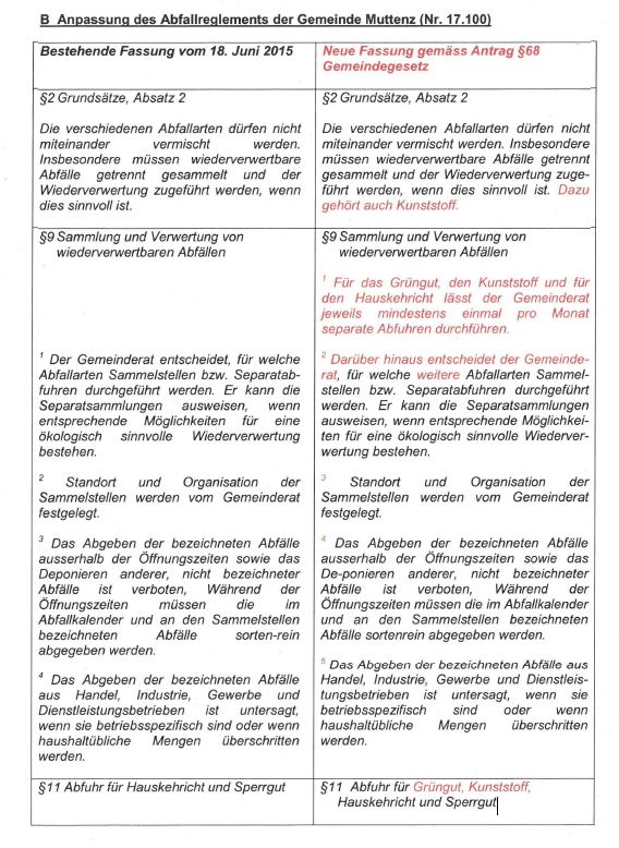 Die Änderungen gehen aus der angefügten synoptischen Darstellung des Abfallreglements hervor.
